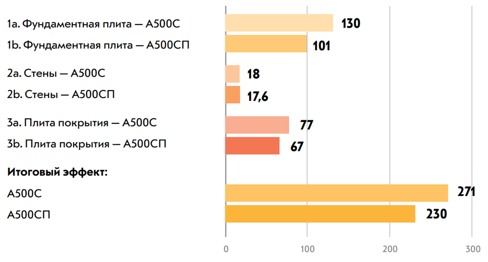 Снижение расхода арматуры в среднем составило 17,6%, а в отдельных элементах — до 29% (наибольший эффект достигнут в изгибаемых элементах).