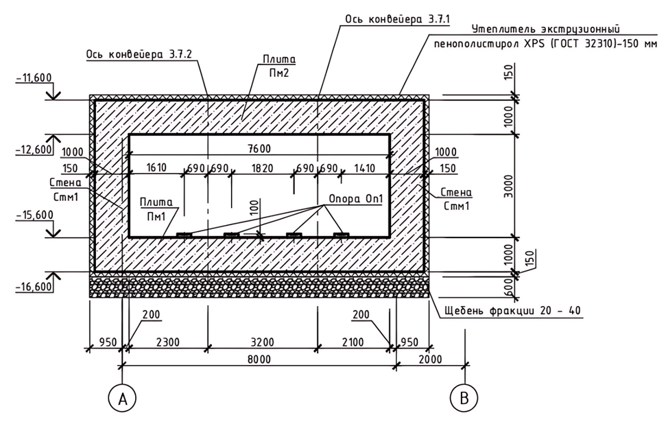 - монолитная плита днища толщиной 1000 мм.