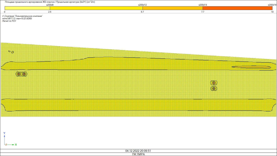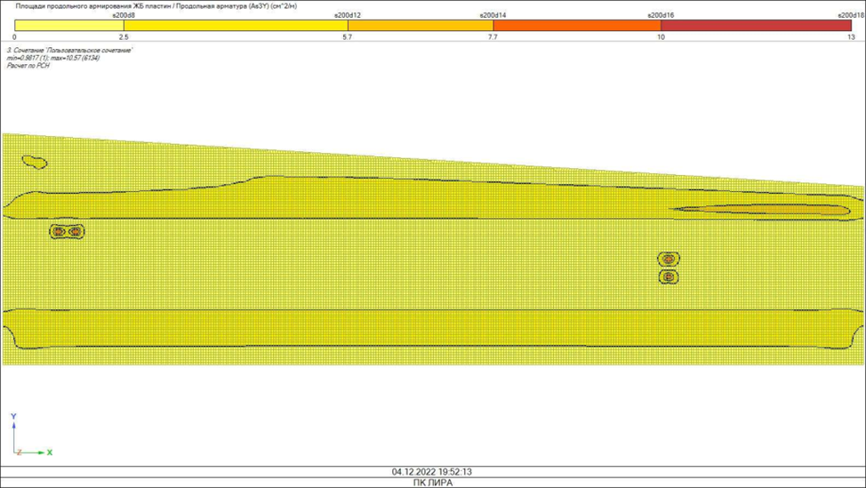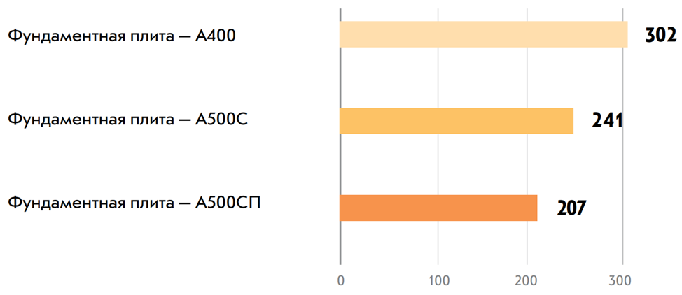 По результатам конечно-элементного анализа было определено армирование при использовании арматуры А400 и А500С, а затем определена материалоемкость армирования с применением арматурного проката Армакс 500 (Ау500СП) с учетом положений СТО 36554501-065-2020, которые включают в себя повышенное расчетное сопротивление арматуры в сравнении с А500С, снижение ширины раскрытия трещин за счет улучшенного сцепления с бетоном, а также с учетом уменьшения длины нахлеста рабочей арматуры.