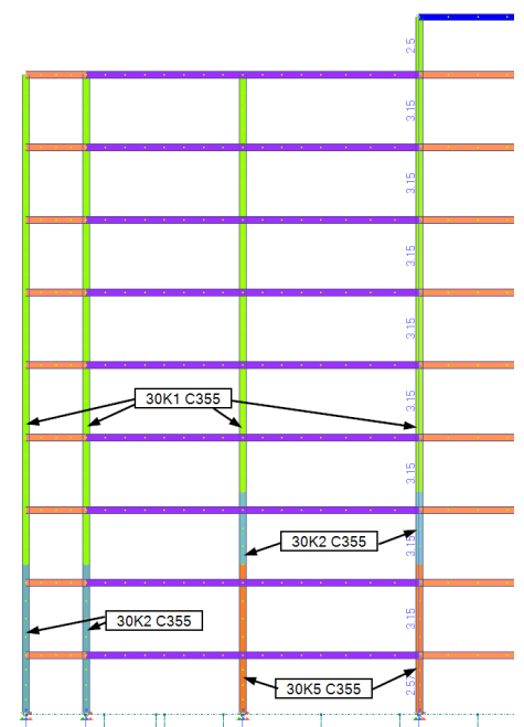 Нагрузки на колонны существенно уменьшаются по мере подъема по высоте здания, поэтому сечения целесообразно унифицировать по ярусам, выделяя несколько уровней с постоянным сечением, а не изменяя его в каждом этаже. Такой подход обеспечивает наиболее эффективное решение с точки зрения металлоёмкости, изготовления и монтажа.